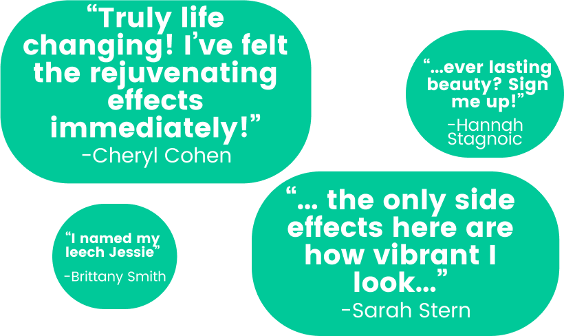 When we think of beauty we think of what is, but what if instead, we thought of what could be? Dr. Galen, a scientist at the Connerie Institute In Vancouver, Canada, known as the world-renowned leading Beauty & Wellness Institute of the World, discovered the secret to true life-changing beauty.It turns out an ancient technique, commonly used in Egyptian cultures, hidden away and dismissed with the introduction of BIG PHARMA holds secrets to endless youth. And once we rediscovered the magical technique we had to reveal it to the world. It is the time-honored practice of bloodletting.Bloodletting works by allowing the leeches to do what they were designed to do by nature, essentially blood was created and then used up; it did not circulate, and so it could "stagnate" in the extremities. The humoral balance was the basis of illness or health, the four humours being blood, phlegm, black bile, and yellow bile, relating to the four Greek classical elements of air, water, earth, and fire respectively. Blood is the dominant humour and the one in most need of control. In order to balance the humours, the secret to ever-lasting beauty, a physician would either remove "excess" blood (plethora) from the patient.Essentially, the leeches act as a filter, they suck the bad blood with toxins out, and put the clean blood back into your body.